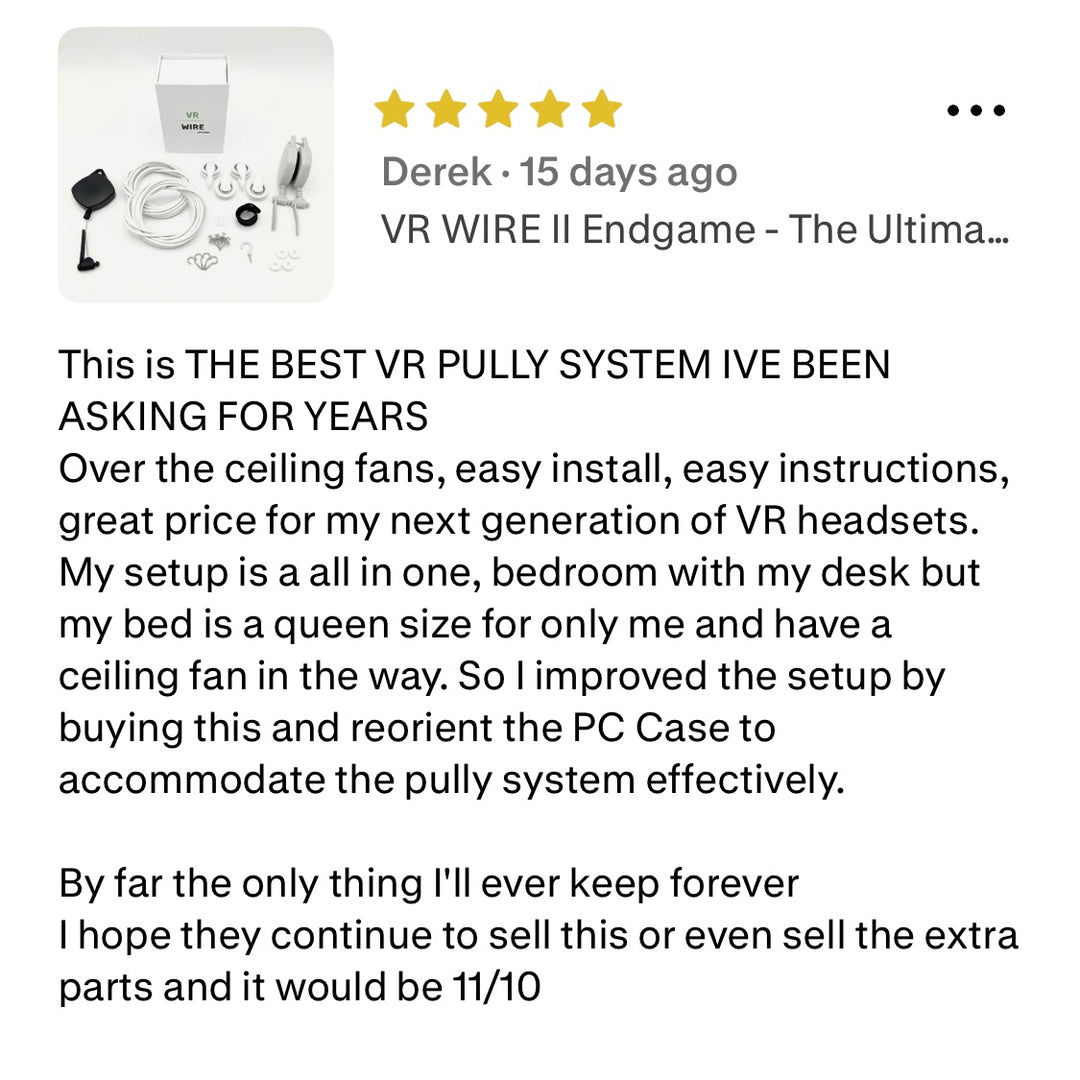 - Reduce potential cable damage from twisting. With a standard cable management system, the last retractor is attached directly to the cable, about a foot from the VR headset. Repeated turns in one direction put stress on this short section of the cable, which over time can lead to damage. With VR WIRE II, the cable moves freely through the pulley wheels, which helps distribute the effect of twisting over a longer length of the VR cable. Although it doesn't completely solve the problem, this extra freedom of movement helps reduce the potential damage to your VR cable from twisting.